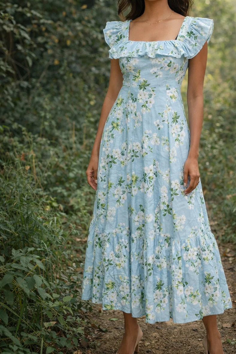 The Sabrine dress has a beautiful ruffle neckline, boasting an elastic strap detail at the rear, dignified panels on the bodice, and a stylish frill at the bottom.
